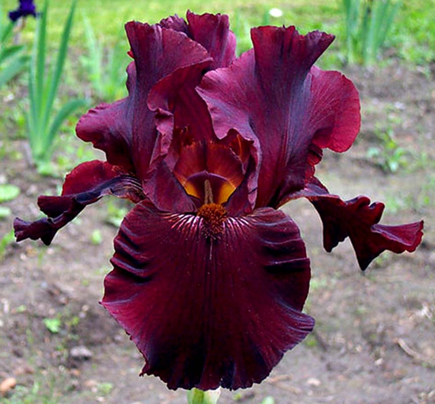 Рассада ириса Almaden относится к ирисам достаточно редкой красной расцветки. Высокий бородатый сорт имеет в высоту до 90 см. Нижние доли (фолы) и верхние доли (стандарты) окрашены одинаково в насыщенный темно-красный, переходящий в красно-каштановый с бархатной структурой или темно-бордовый. Бородка также красно-коричневая, а в верхней части бронзовая с расходящимися от нее белыми лучиками. Верхние и нижние доли - слабо гофрированные Цветение позднее. Сорт известен с 1990 года и не теряет своей популярности.